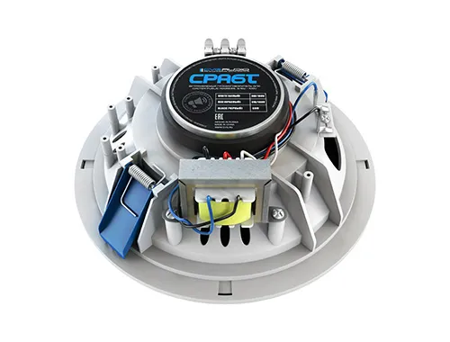 CVGaudio CPA6T – широкополосный, встраиваемый в потолок громкоговоритель для систем Public Address. Данная модель используется для воспроизведения информационных голосовых сообщений, аварийно-пожарного оповещения и трансляции фоновой музыки в различных торговых и общественных помещениях. CVGaudio CPA6T хорошо зарекомендовал себя в крупных супермаркетах и общих зонах торговых комплексов, где требуется ненавязчивое воспроизведение фоновой музыки небольшого уровня громкости и в тоже время разборчивые и хорошо читаемые голосовые сообщения. Широкополосный громкоговоритель CVGaudio CPA6T предназначен для работы в составе трансляционных 100V линий и имеет установленный с обратной стороны корпуса качественный согласующий трансформатор с отводами двух различных мощностей - 3 и 6W. Спикерный кабель подключается к акустической системе с помощью кабельного терминала с надежным винтовым зажимом (винт должен фиксироваться с помощью отвертки). Выбор используемой мощности осуществляется при подключении спикерного кабеля – Вы фиксируете кабель в зажиме соответствующем необходимой Вам мощности. Всего в кабельном терминале три зажима – СОМ(-), 3W(+) и 6W(+). Соответственно подключение должно быть – СОМ и 3W или COM и 6W. Диффузор динамика изготовлен из целлюлозы высокой плотности, корпус из качественного ABS пластика стойкого к воздействию солнечного света и пыли, диффузор закрыт декоративной сеткой из алюминия. Громкоговоритель CPA6T выпускается только в белом корпусе. В подвесной потолок громкоговоритель надежно крепится с помощью удобных подпружиненных самозажимных металлических пластин. Благодаря очень небольшому весу динамик можно встроить фактически в любой тип подвесного потолка. Установка динамика займет у Вас считанные минуты. Аккуратный, с тонкой внешней пластиковой рамкой, неброский внешний вид акустических систем CVGaudio CPA6T позволяет незаметно вписать их в интерьер помещения, не нарушив общего стиля, а качественная сборка и тщательно подобранные комплектующие обеспечат бесперебойную работу устройства в течение долгого времени. Акустические системы CVGaudio CPA6T обеспечат достаточное качества звучания фоновой музыки для общих и служебных помещений и отличное качество воспроизведения речевых сообщений, но для воспроизведения фоновой музыки в кафе, бутиках и ресторанах более правильно использовать двухполосные акустические системы – CVGaudio серии CR и CRX.Серия PA for Public Address