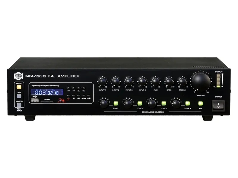 Описание усилителяSHOW MPA-120RS — это мощная транслирующая система с выходной мощностью 120 Вт, работающая при напряжении 24 В, 70/100 В. Оснащена MP3-плеером и поддерживает подключение четырёх микрофонов или линейных входов, а также имеет AUX-вход. Система позволяет управлять звуком в четырёх зонах.