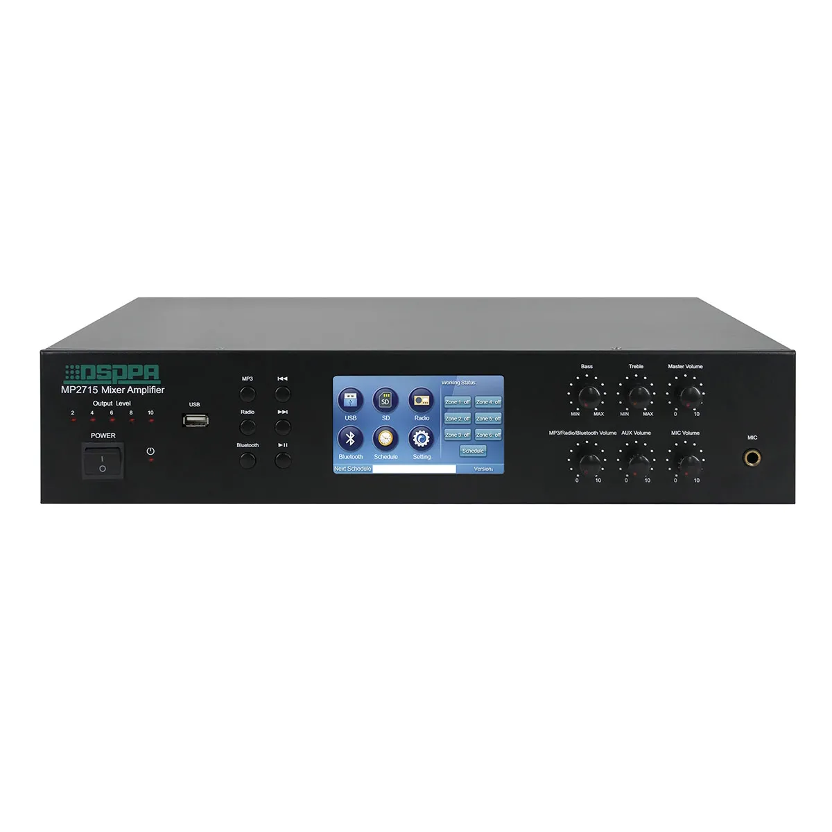 Комбинированный микшер-усилитель 6 зон DSPPA MP-2715 предназначен для смешивания звуковых сигналов из разных источников. Преимуществом данного гаджета является его портативность, 1 - вход для микрофонов, 1- AUX вход и 1 выход. Имеет встроенные источники аудио сигнала: МР3-плеер, AM/FM тюнер, USB/SD порт и bluetooth. Также данный усилитель оснащён программируемым недельным таймером, а это возможность сохранять программы включенными. В качестве защиты имеется предохранитель переменного и постоянного тока, автоматическая перезагрузка в случае короткого замыкания. Товар предназначен для диджеев, звукозаписывающих студий и концертных площадок. Основные достоинства: лаконичный дизайн, компактные габариты (420/88/338мм), возможность установки в рековую стойку (2U), управление частотами (низкие/высокие), цифровая панель.Характеристики и возможности