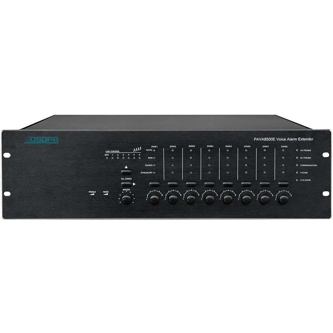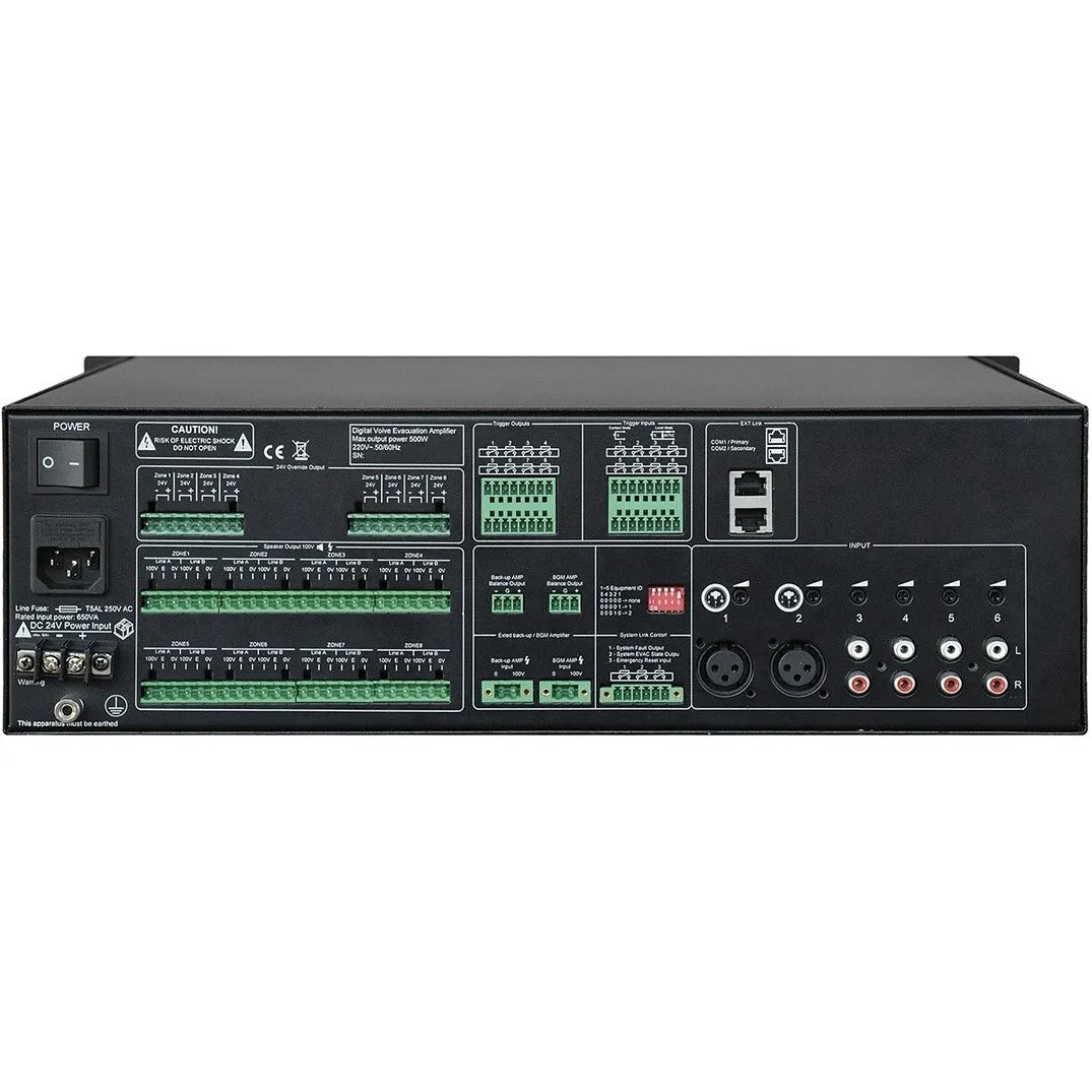 Блок расширения DSPPA PAVA-8500EDSPPA PAVA-8500E — это блок расширения системы на 8 зон с усилителем мощности 500 Вт. Поддерживает «горячий резерв» усилителя и может быть расширен до 160 зон путём каскадирования. Оснащён контролем работоспособности компонентов и линий, а также контролем целостности линий громкоговорителей и электропитания. Имеет 4 линейных входа (RCA), 2 микрофонных входа (XLR), 8 триггерных входов («сухой» / питание) и 8 триггерных выходов (0 / 24 В).