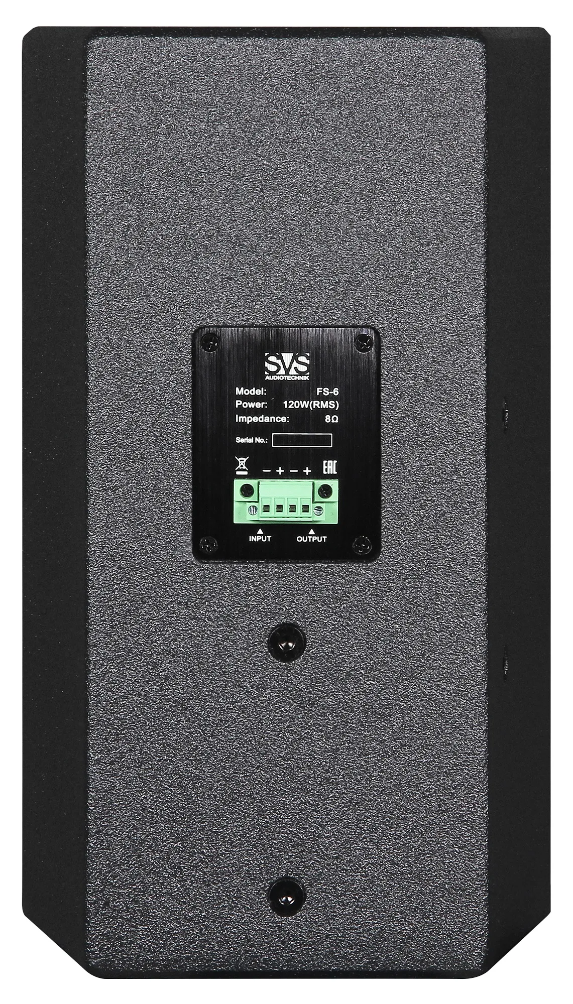 FS-6 – пассивная двухполосная акустическая система. Система оснащена драйверами 1×6,5"(165мм)/2" звуковая катушка НЧ, 1×1"(25mm)/ 1" звуковая катушка ВЧ. Разъёмы: Phoenix connector. Максимальный уровень звукового давления: 111 дБ продолжительное, 117 дБ пиковое.Поворотный рупор 90°×50°. Материал корпуса берёзовая фанера, покрытая износостойкой и водостойкой краской. Возможна установка на стену или подвес на 3 точки.