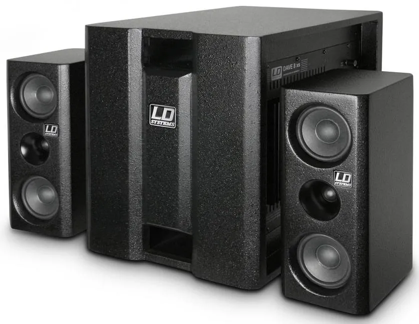 Портативная мультимедийная звуковая система 2.1 LD Systems DAVE 8 XS - мультимедийная система 2.1 с высокопроизводительным BandPass сабвуфером с 8-дюймовым звукоизлучателем и двумя сателлитами, каждый из которых оснащен 4-дюймовым среднечастотным излучателем и 1-дюймовым высокочастотным, каждый из которых с шелковым куполом.Система обеспечивает кристально чистый звук и была специально разработана для использования в составе домашней мультимедийной системы; также подходит в качестве контрольных мониторов для домашней студии или фонового звука на небольших объектах, таких как бары и рестораны.