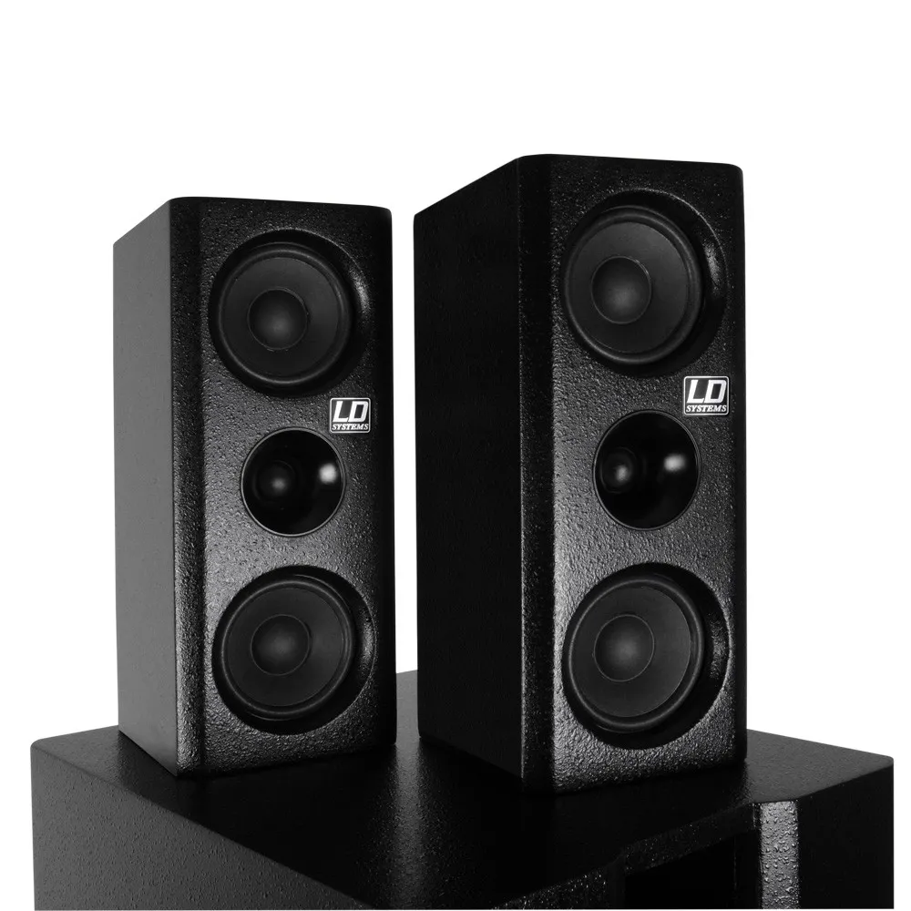 В сабвуфер встроен высокопроизводительный усилитель класса AB. Мультимедийная система LD DAVE 8 XS имеет линейные входы на разъемах XLR и RCA и оснащена всеми стандартными системами защиты. Встроенный лимитер защищает систему от перегрузки и обеспечивает длительный срок службы. На боковой стороне сабвуфера, в дополнение к выключателю ON/OFF и переключателю реверса фазы (180°), имеется отдельный регулятор громкости, который позволяет найти идеальный баланс ярких высоких частот и мощного баса. Сателлиты оснащены 16-мм фланцем и поэтому совместимы со стойками из комплекта DAVE 8 SET 2.