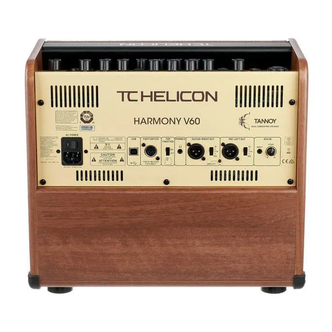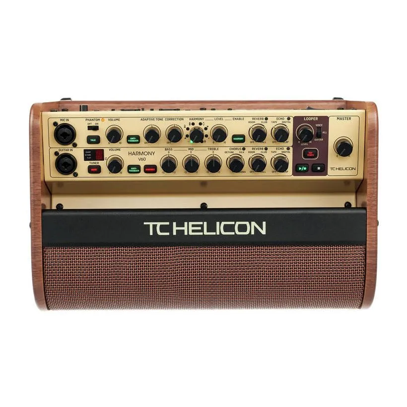 Канал Voice имеет великолепные встроенные эффекты TC HELICON: Adaptive Tone, Intelligent Anti-Feedback, Pitch Correction, Harmony, Reverb, Delay. Эффект Adaptive Tone автоматически обрабатывает вокал для читаемости в миксе. Эффект Harmony автоматически создает до 2-х дополнительных гармонических голосов для вашего вокала. Канал Guitar оснащён 3-полосным эквалайзером, а также тюнером и встроенным эффектами TC HELICON: BodyRez, Intelligent Anti-Feedback, Reverb, Delay, Chorus. Эффект BodyRez предназначен для гитар с пьезозвукоснимателем и предназначен воссоздавать естественное звучание корпуса акустической гитары. Функция Top Tweeter обеспечивает комфортный мониторинг за счёт дополнительного динамика, направленного вверх. Встроенный лупер позволяет зацикливать записи длительностью до 1,5 минут. Комбоусилитель поставляется в комплекте с 4-х кнопочным настраиваемым футсвичем (ножным напольным переключателем).
