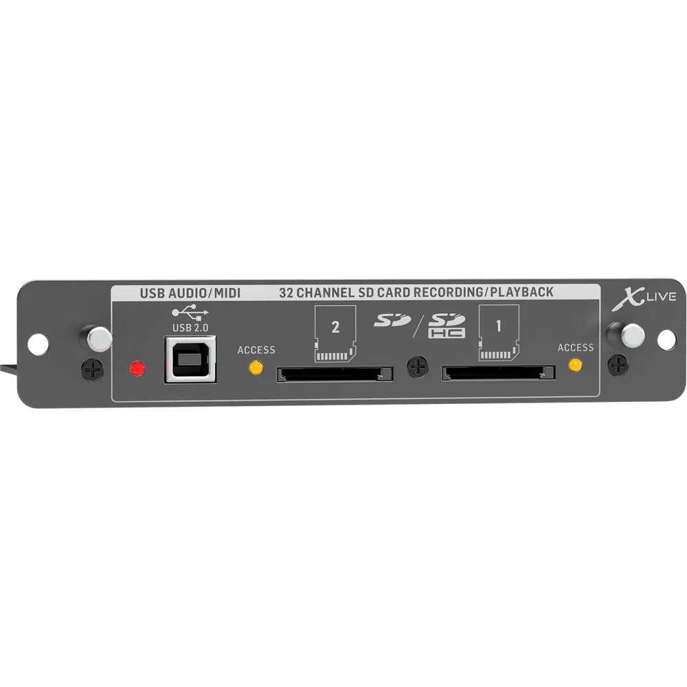 Описание карты расширенияКарта расширения для микшеров X32 позволяет записывать аудио с 32 каналов на две SD/SDHC карты объёмом до 32 Гб. Максимальная продолжительность записи — 200 минут. Имеется 32-канальный USB 2.0 интерфейс для студийной работы или записи выступлений. Запись на карты памяти и использование USB могут происходить одновременно и независимо друг от друга. Управлять функциями карты можно удалённо через компьютер, устройства на Android, iPad и другие интерфейсы.
