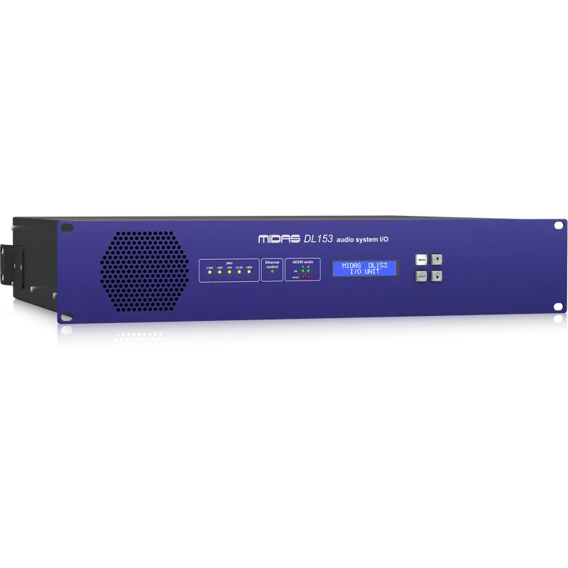 MIDAS DL153 — это аудиоинтерфейс с 16 дистанционно управляемыми микрофонными предусилителями. Предусилители работают от фантомного питания +48 В. Предусмотрена регулировка усиления от -2,5 до +45 дБ с шагом в 2,5 дБ. Частота семплирования — 96/48 кГц. Входные/выходные терминалы оснащены балансными XLR-разъёмами. На задней панели — 8 линейных аудиовыходов. Двойные сетевые порты AES50 от Neutrik со светодиодной индикацией. Устройство можно установить в рэковую стойку 2U.