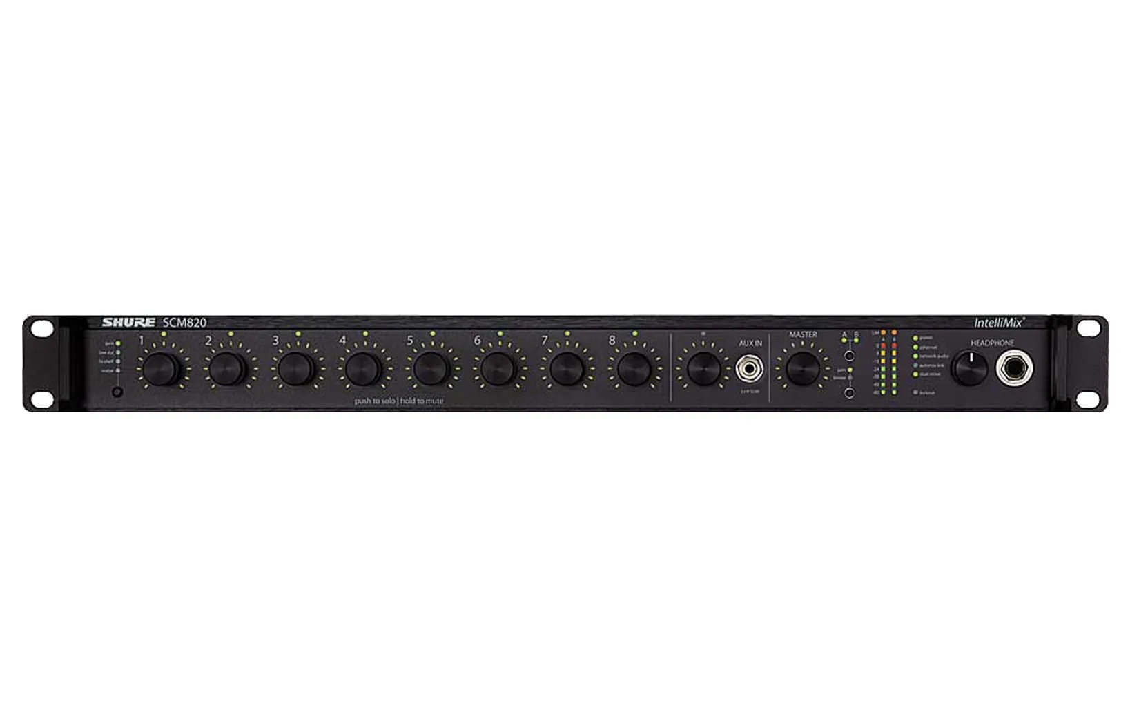 SHURE SCM820E-DAN — это профессиональный восьмиканальный микшер. Он оснащён технологией Dante для быстрой синхронизации через Ethernet и Dante Virtual Soundcard для записи звука на компьютер.