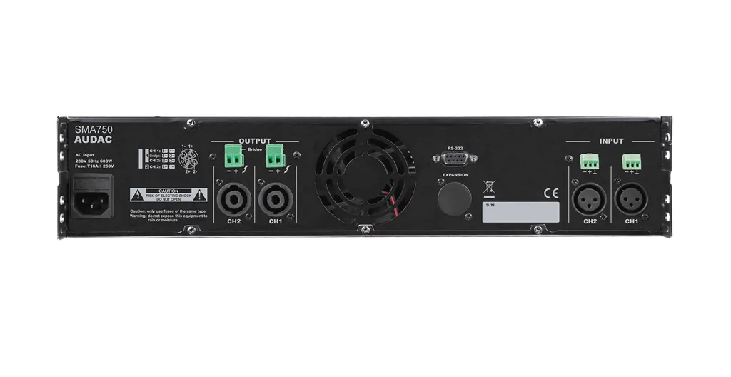 AUDAC SMA750 - это двухканальный усилитель мощности класса D, предназначенный как для стационарных, так и для туровых комплексов звукоусиления.Прежде всего, данная модель оснащена цифровым информативным ЖК дисплеем, на котором отображается текущий режим работы усилителя, и все необходимые настройки и параметры. Также, на его передней панели расположен цифровой порт USB, который в свою очередь позволяет загружать на внешний накопитель пользовательские предустановки, а так же выполнять роль USB-ключа. Стоит отметить, что вход в систему при наличии вышеупомянутого ключа может осуществляться на двух уровнях: "Администратор" и "Пользователь". Дополнительно, в усилителе предусмотрен управляющий цифровой порт стандарта RS-232.