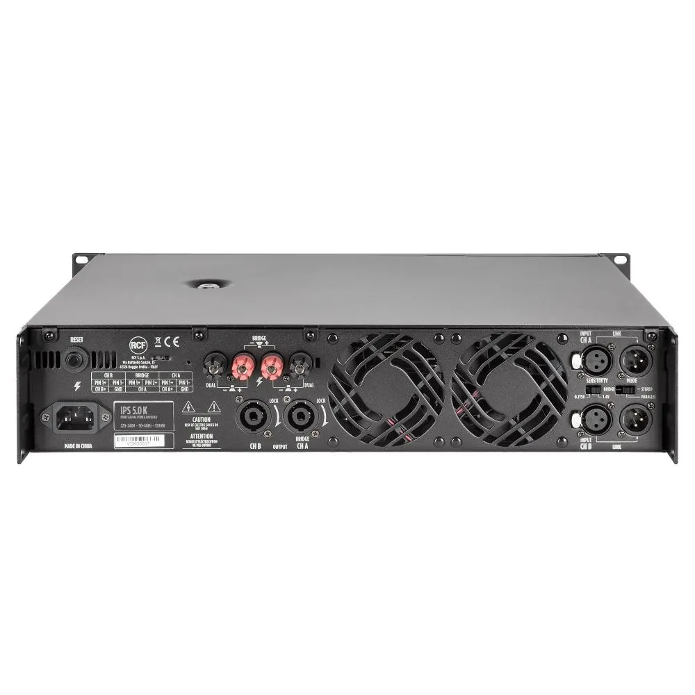RCF IPS 5.0K — двухканальный усилитель мощности класса H. Выдает до 2 х 2600 Вт при сопротивлении 4 Ом. Оснащен регулировкой усиления, индикаторами сигнала, клипа и неисправностей. Имеет стерео XLR входы и выходы, переключатели режимов работы, систему защиты от короткого замыкания и перегрева.
